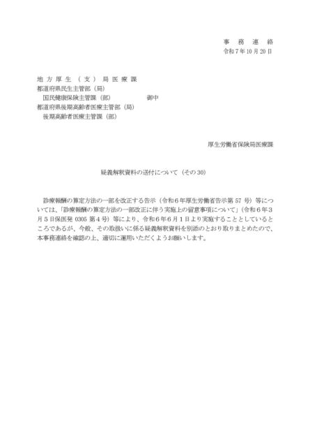 疑義解釈資料の送付について(その30)示される 2025年10月20日 通知・疑義解釈 厚生労働省から2025年10月20日付で事務連絡、疑義解釈資料の送付について(その30)(以下)が示された。 画像をクリックするとファイルが表示されます